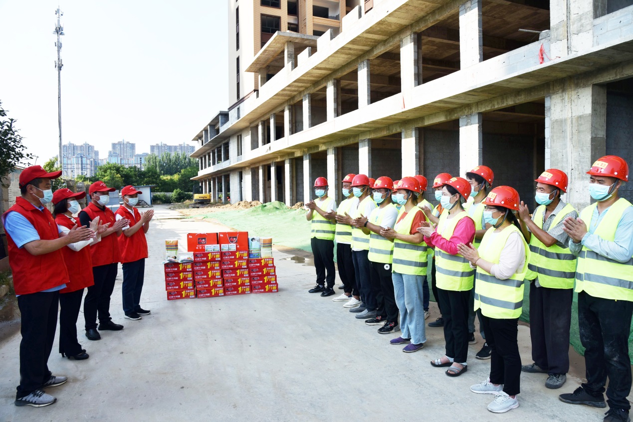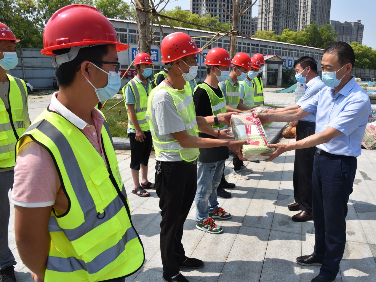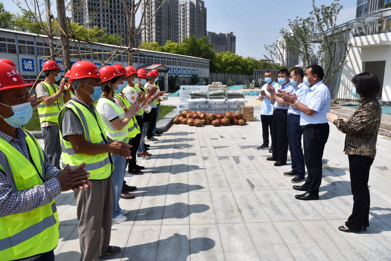 在市住建局副局長(zhǎng)尹群安、建管科科長(zhǎng)王林現(xiàn)和集團(tuán)公司董事長(zhǎng)、總經(jīng)理高峰、工會(huì)主席楊紅瑋等人員的陪同下,楊義卿副主席一行分別察看了工地現(xiàn)場(chǎng),詳細(xì)了解了工程進(jìn)展和疫情防控等情況,對(duì)工程的現(xiàn)場(chǎng)管理、安全、質(zhì)量等工作給予了贊賞,并看望、慰問(wèn)了施工人員,為他們送去了白糖、西瓜、綠豆、礦泉水、毛巾、花露水等防暑降溫用品。 楊義卿副主席一行還走到工人中間,親切詢問(wèn)了他們的工作、生活等情況,并叮囑工地項(xiàng)目負(fù)責(zé)人,要合理安排一線員工 在高溫期間的作息時(shí)間,備好防暑降溫物品,保證工人的身體健康。他說(shuō),連日來(lái),大成集團(tuán)的建設(shè)者們不畏酷暑、冒著高溫,一如既往地奮戰(zhàn)在施工一線,讓人敬佩,這支特別能戰(zhàn)斗的鐵軍,為美麗的許昌建設(shè)作出了突出貢獻(xiàn),向大家表示親切的慰問(wèn)。他希望大家在高溫天氣下要加強(qiáng)勞動(dòng)保護(hù)意識(shí),提高自我保護(hù)能力,注意防暑降溫,把身體健康放在第一位,強(qiáng)化安全意識(shí),在保障安全的前提下,完成好本職工作。同時(shí)希望大成集團(tuán)這支建筑行業(yè)的龍頭企業(yè),要肩負(fù)好關(guān)愛(ài)員工的社會(huì)責(zé)任,維護(hù)好員工的權(quán)益,做好高溫防暑等勞動(dòng)保護(hù)工作,確保打造出更多的優(yōu)質(zhì)精品工程。
