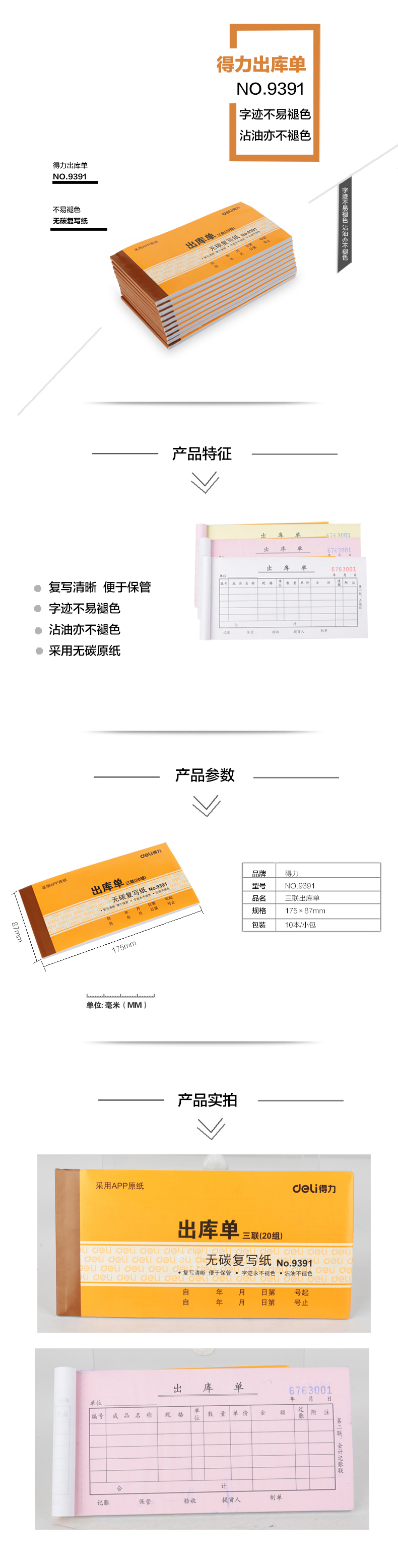 得力三聯(lián)出貨出庫(kù)單 無(wú)碳復(fù)寫(xiě)紙手寫(xiě)倉(cāng)庫(kù)單據(jù)本 9391
