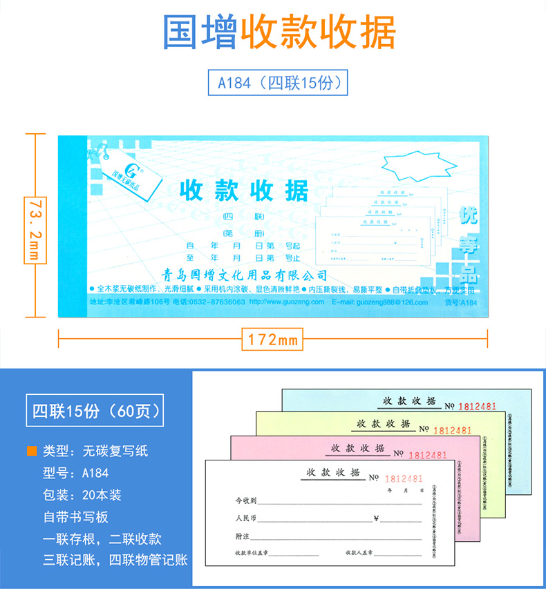 國(guó)增A184四聯(lián) 收款收據(jù) 無(wú)碳復(fù)寫(xiě)紙 手寫(xiě)單據(jù)