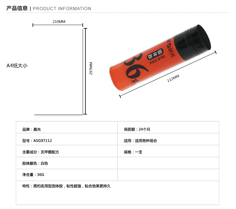 1盒12支裝 晨光醒目固體膠棒大號36G學生手工粘貼辦公膠棒 97112