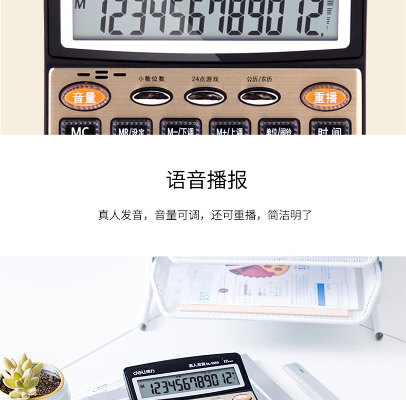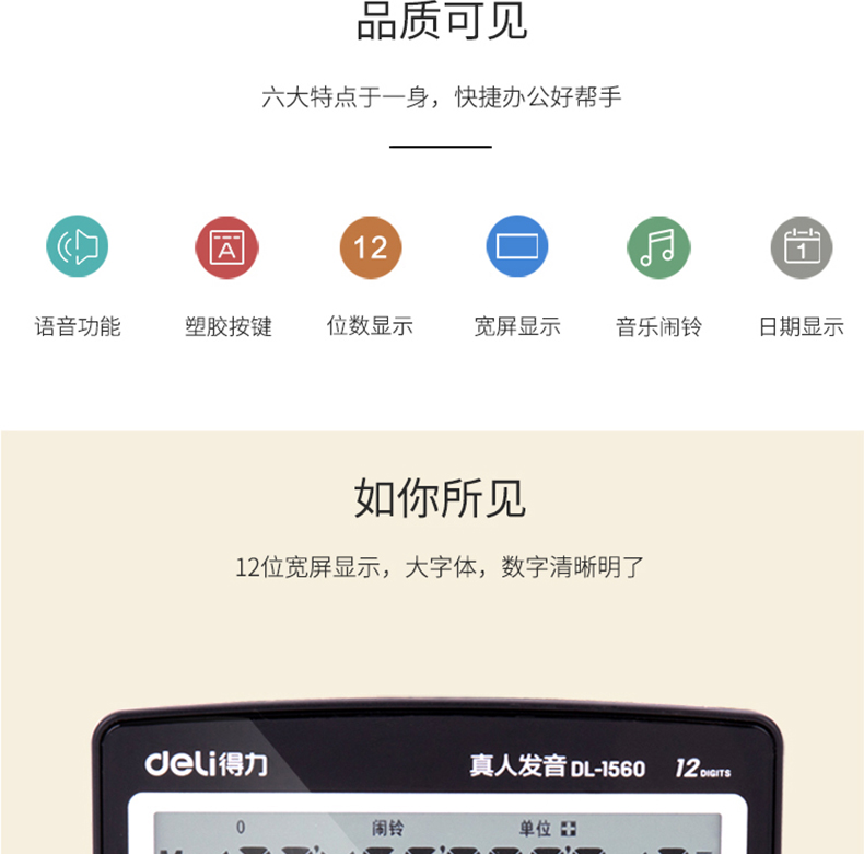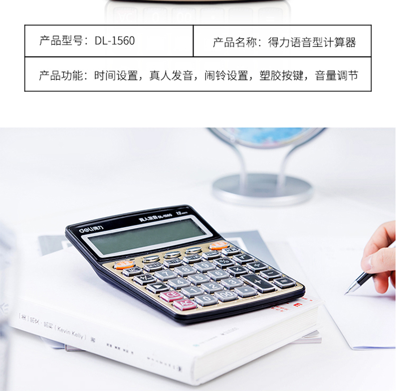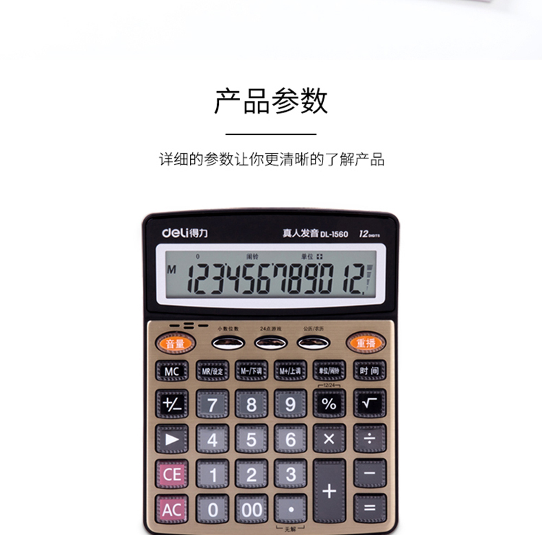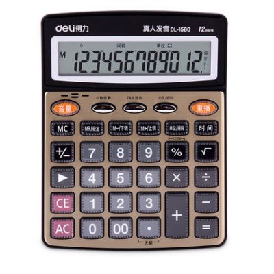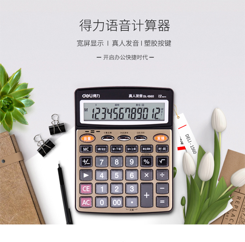 得力1560語(yǔ)音計(jì)算器 大號(hào)塑膠鍵12位真人發(fā)音帶鬧鐘多功能計(jì)算機(jī)