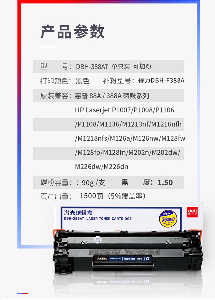 得力(deli)DBH-388AT易加粉硒鼓 88A打印機(jī)硒鼓(適用惠普 P1007/P1008/P1106/P1108/M1136/M1213nf/M1216nfh)dyhc