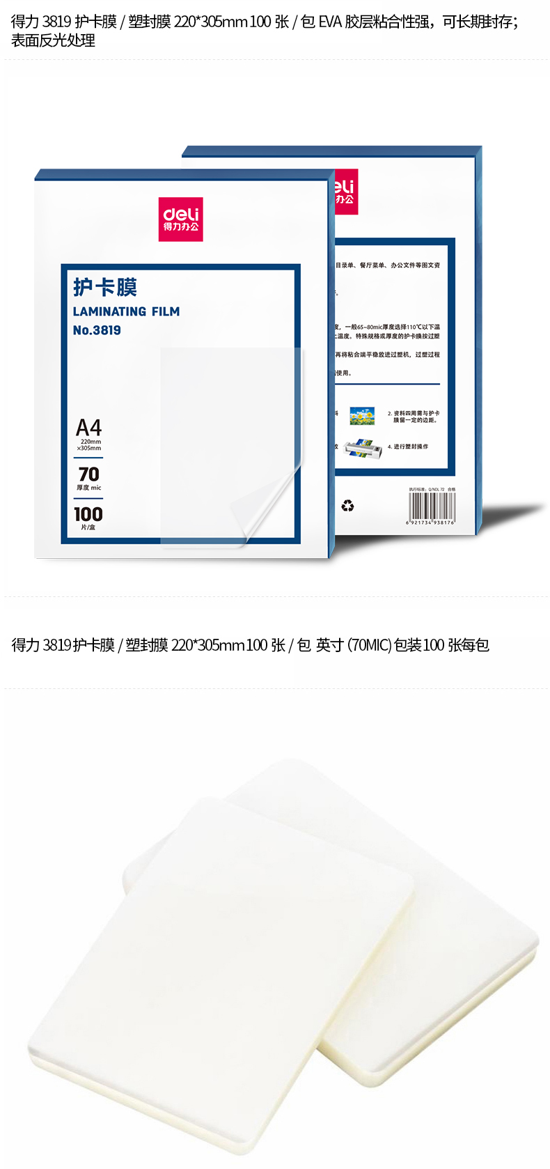得力3819 A4 護卡膜(透明)(100片/包) 塑封膜