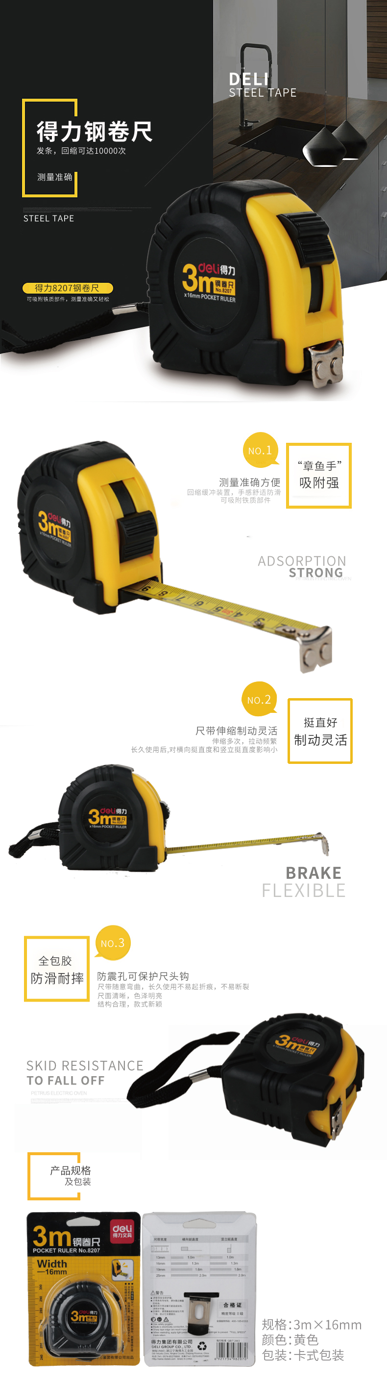 得力8207 8208 8209 8204鋼卷尺 強力磁鐵“章魚手”可吸附鐵部件尺子