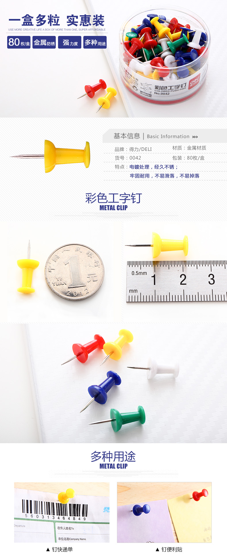 得力工字釘彩色圖釘按釘大頭釘照片板釘創(chuàng)意軟木板釘包郵80枚/盒 0042