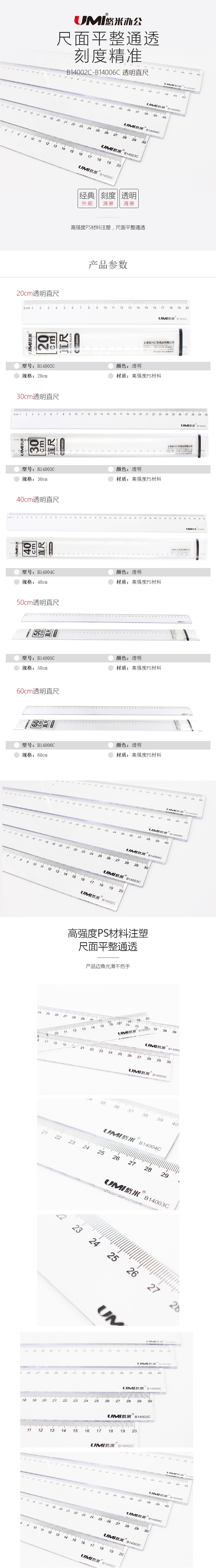 悠米直尺20/30/40/50/60cm尺子直尺 透明直尺有機尺直尺學生尺