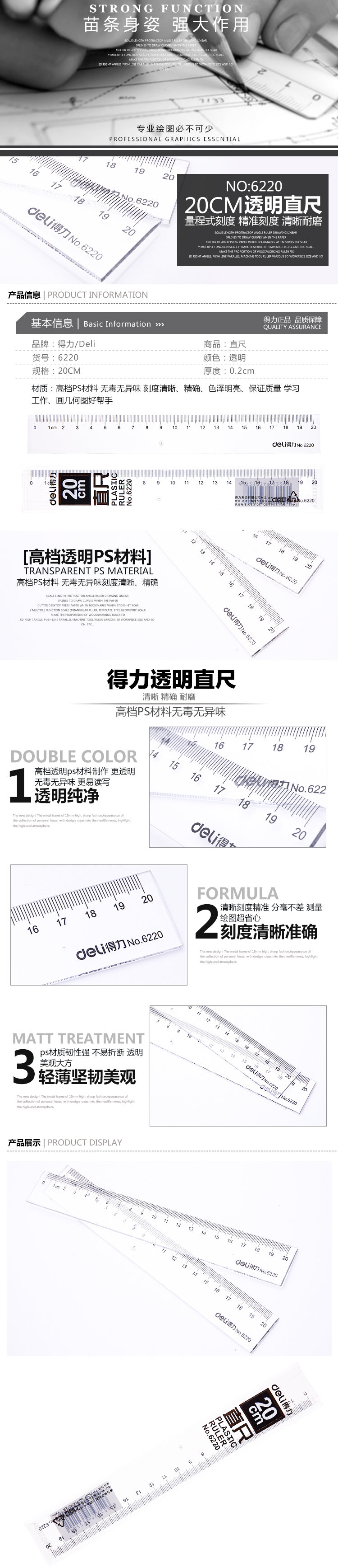 得力6220/6230/6240塑料直尺20cm/30cm/40cm多規格小學生文具 繪圖制圖工具 透明直尺 開學