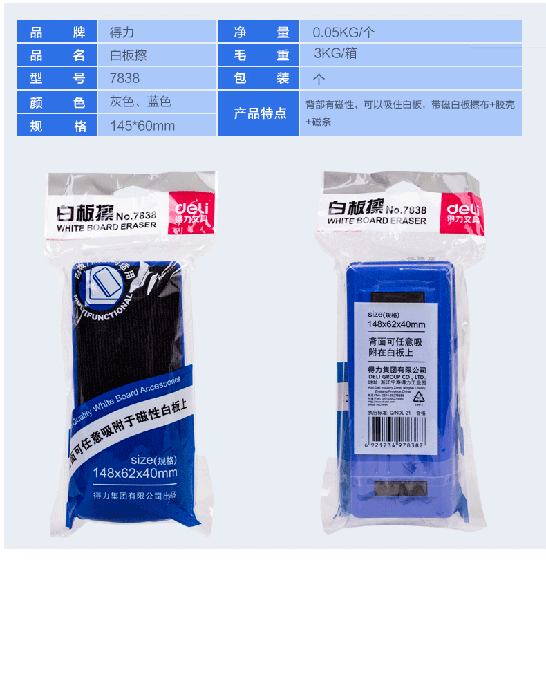 得力7838大號磁性白板擦 黑板擦 畫板板擦 易擦干凈 辦公用品